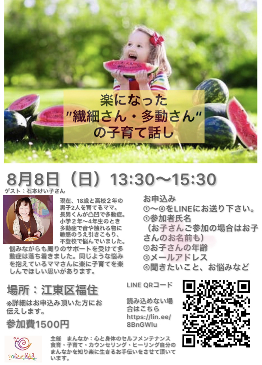 「楽になった繊細さん・多動さんの子育て話し」会を8月8日(日)13:30~15:30 に開催します!